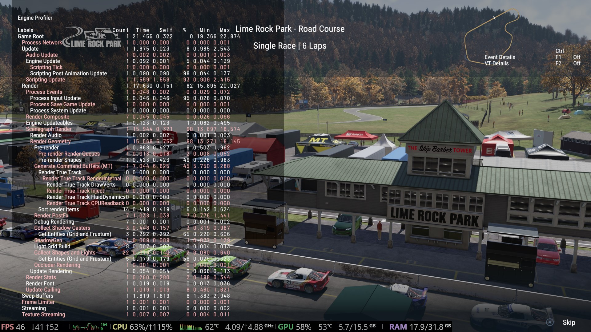 On this shot, you can see that the GPU is hardly busy at all, yet the frame rate is poor, and a few CPU threads work overtime. The in-game CPU profiler clearly shows the culprit – rendering the scene takes over 17.6 milliseconds, with nearly half of this time spent on generating the command buffers for the GPU to render!